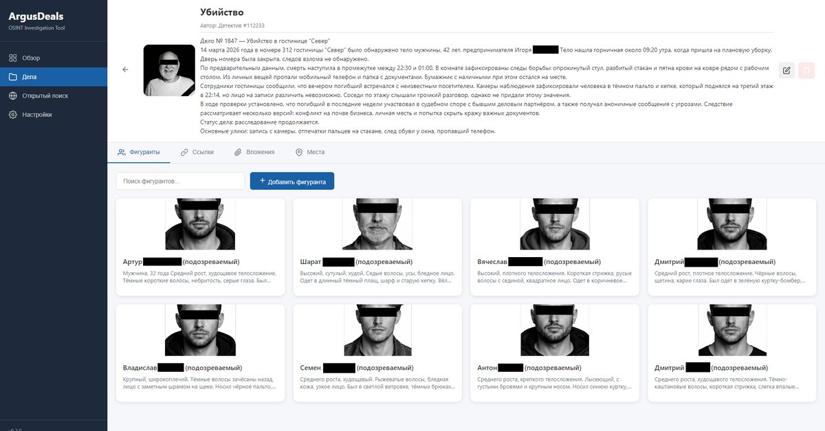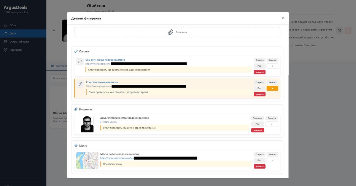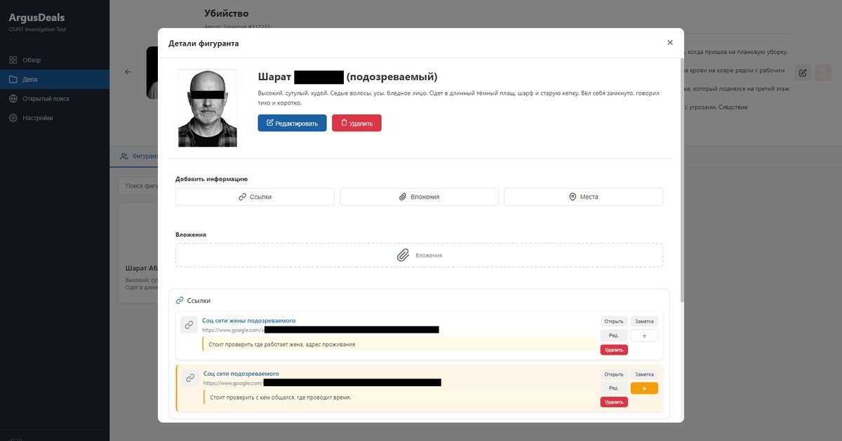 Профессиональное приложение для детективов и частных расследований. Единое пространство для создания дел, ведения фигурантов, анализа связей и визуализации сложных расследований с помощью интерактивной доски